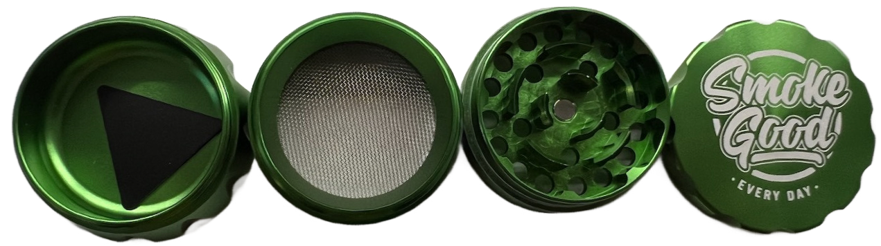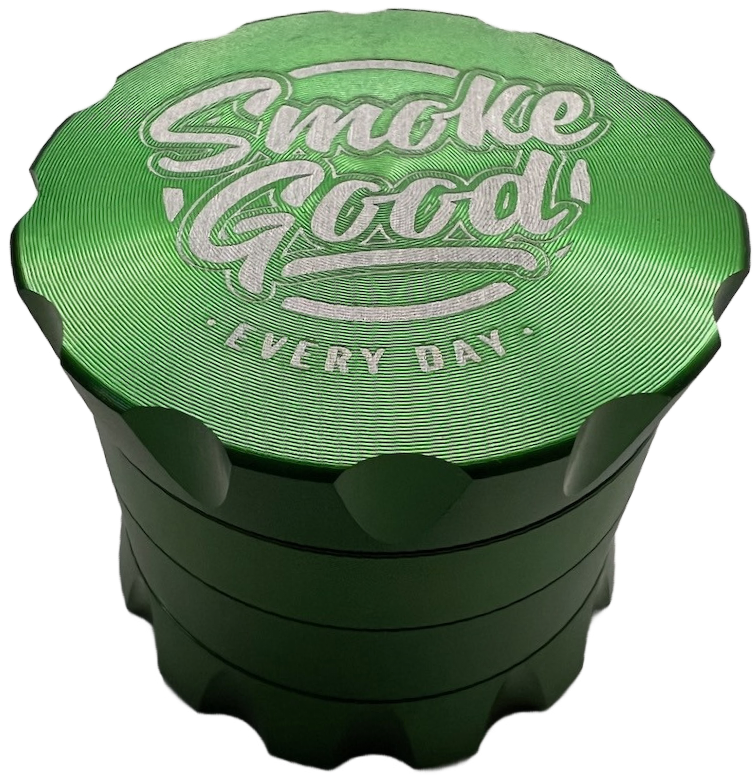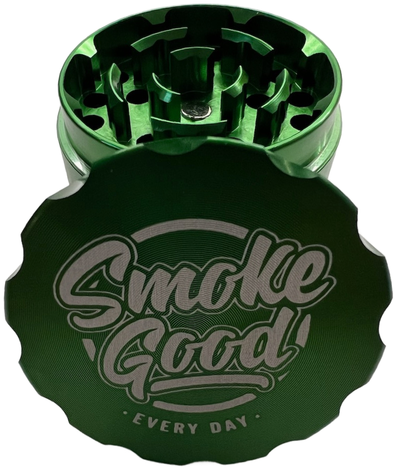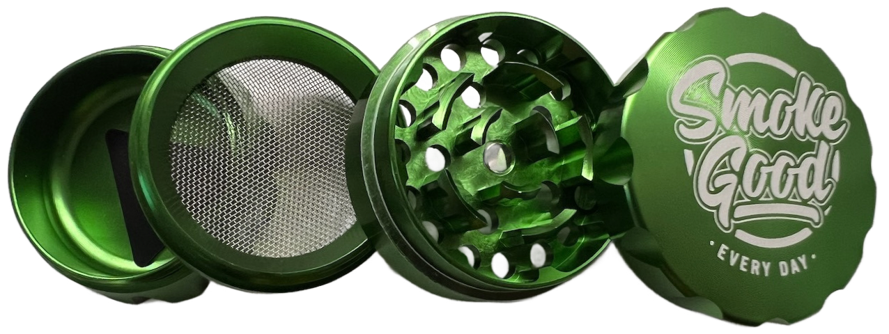 This vibrant green 4-piece grinder features a ridged top for added grip and visual flair, paired with a sleek, uniform body. Its sharp metal teeth and precision-cut holes deliver an effortless grind, while the built-in mesh screen filters fine particles into the lower chamber. Finished with the SmokeGood “EVERY DAY” engraving, this piece is equal parts bold and functional.
