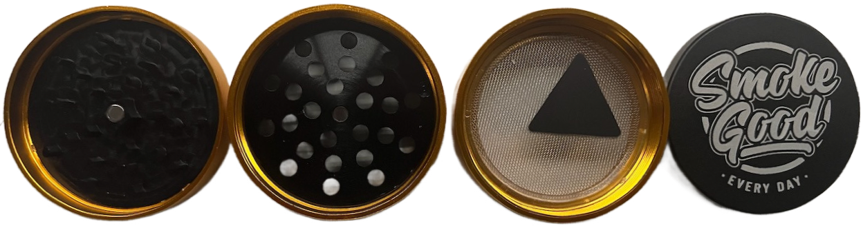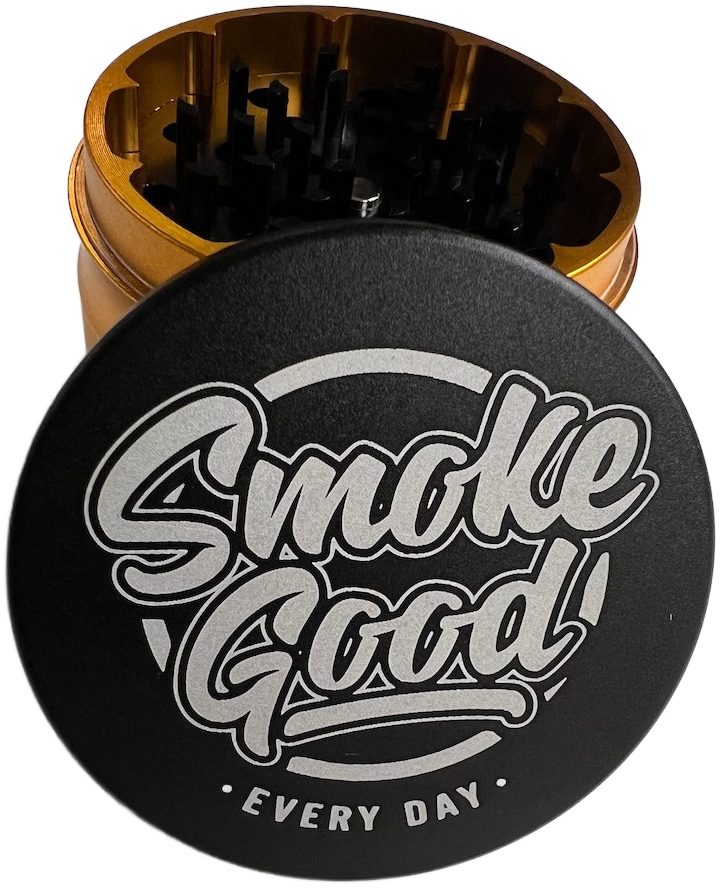 This bold 4-piece SmokeGood Classic Metal Grinder brings luxury and edge together with a matte black exterior and a deep gold interior. Engineered with razor-sharp teeth, a fine mesh kief screen, and a spacious pollen catcher, it delivers a smooth, consistent grind every time. The top lid is laser-etched with the iconic SmokeGood “EVERY DAY” engraving, tying the whole experience together with authority and style.