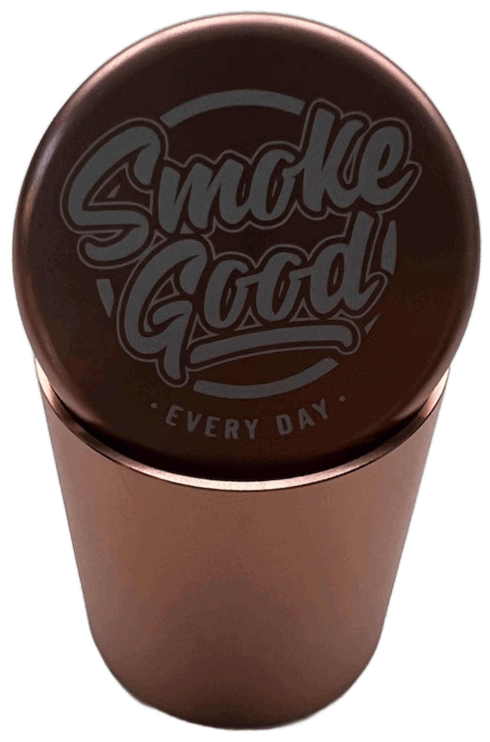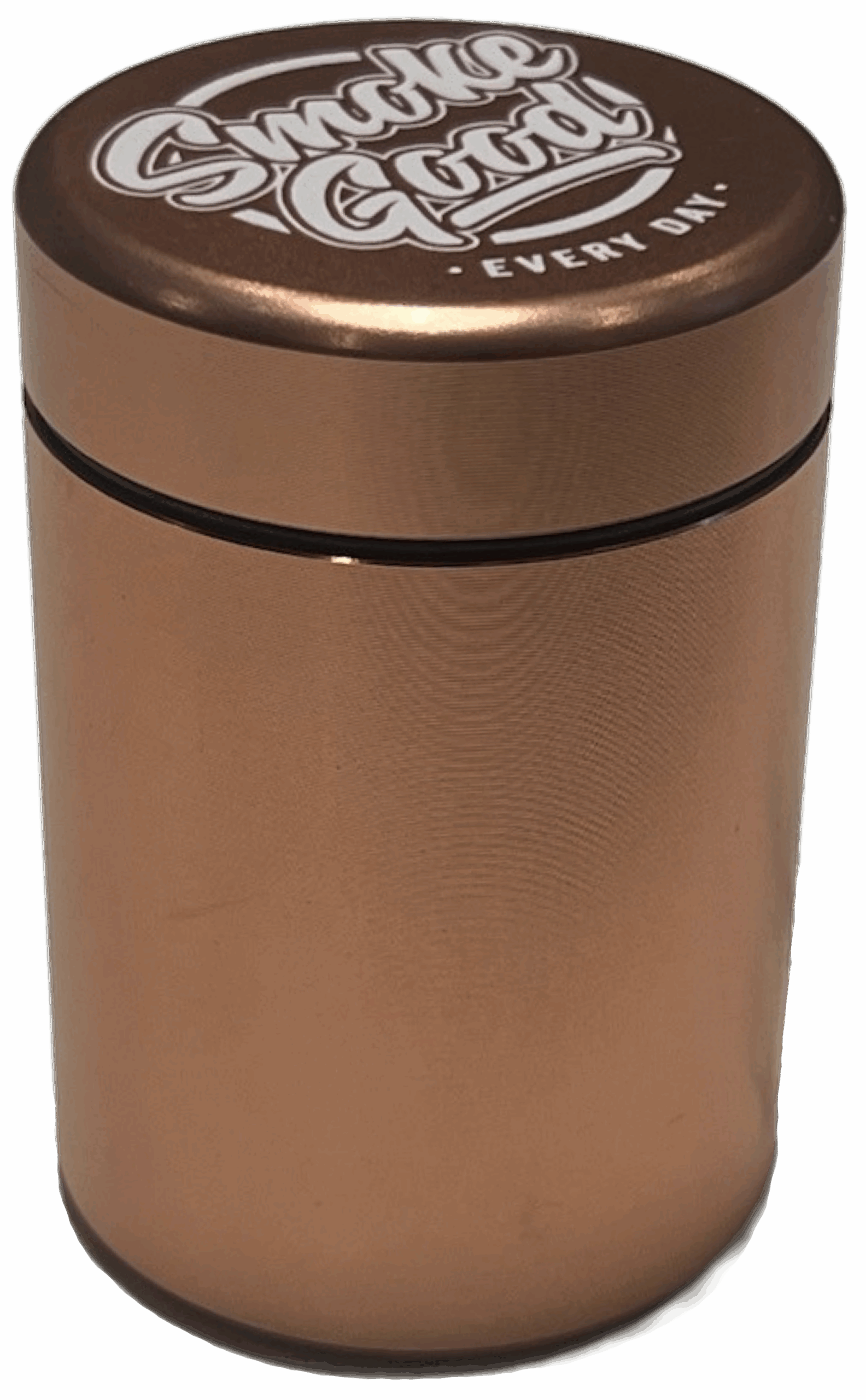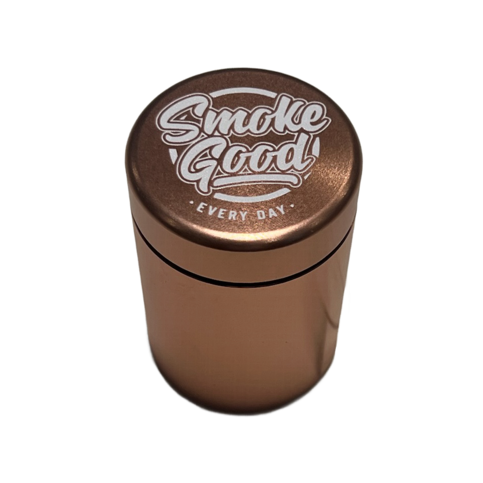A stunning rose gold stash jar with a twist-seal airtight lid, perfect for keeping flower or herbs fresh and secure. Made from lightweight, high-quality aluminum and engraved with the SmokeGood “EVERY DAY” logo. Durable, discreet, and easy to carry, an elevated take on functional storage.