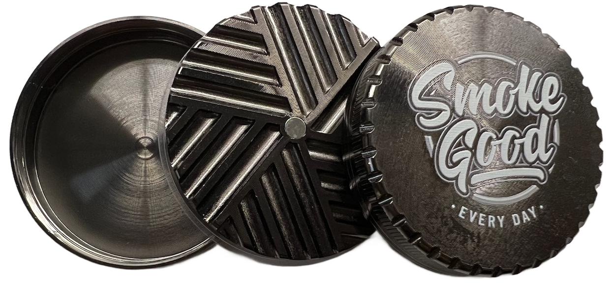 This 3-piece metal grinder features a rugged, ridged-tooth design for smooth, consistent grinding. The sleek black finish is laser-etched with SmokeGood’s “EVERY DAY” logo, and the precision threading ensures a tight seal every time. A solid option for everyday grinding with a premium feel.